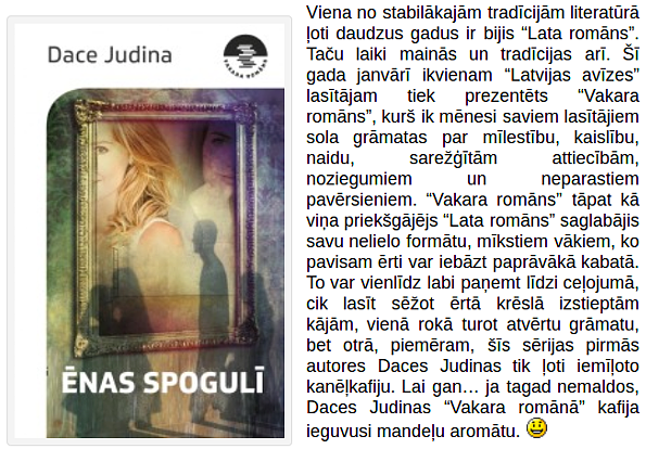 “Vakara romāns” tāpat kā tā priekšgājējs “Lata romāns” saglabājis savu nelielo formātu, mīkstiem vākiem, ko pavisam ērti var iebāzt paprāvākā kabatā. To var vienlīdz labi paņemt līdzi ceļojumā, cik lasīt, sēžot ērtā krēslā izstieptām kājām, vienā rokā turot atvērtu grāmatu, bet otrā, piemēram, šīs sērijas pirmās autores Daces Judinas tik ļoti iemīļoto kanēļkafiju. Lai gan… ja tagad nemaldos, Daces Judinas “Vakara romānā” kafija ieguvusi mandeļu aromātu.